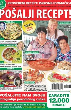 Pošalji recept je kulinarsko izdanje koje donosi nešto sasvim novo na tržište. Po prvi put kod nas, čitaoci su ti koji u potpunosti kreiraju jedan časopis i u njemu predstavljaju svoja kulinarska umeća. Svaki objavljeni recept biva i novčano nagrađen, a tu su i sponzori koji će mnoge obradovati vrednim poklonima.